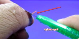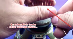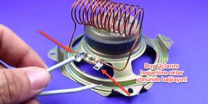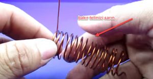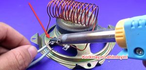 Bu parçaları hazırladıysanız şimdi hemen ilk olarak 30 cm uzunluğundaki çıplak bakırı bir tahta kalemi üzerine sarmaya başlayın. 16 tur attırın. Sonra iki ucu maket bıçağı ile iyice yontun. Ardından bu uçları lehim pastasına daldırın. Çünkü bozuk hoparlörün + ve – uçlarına bu yapay bobini lehimleyeceğiz. + ve – yön önemli değil istediğiniz ucu istediğiniz uca kaynatın.
